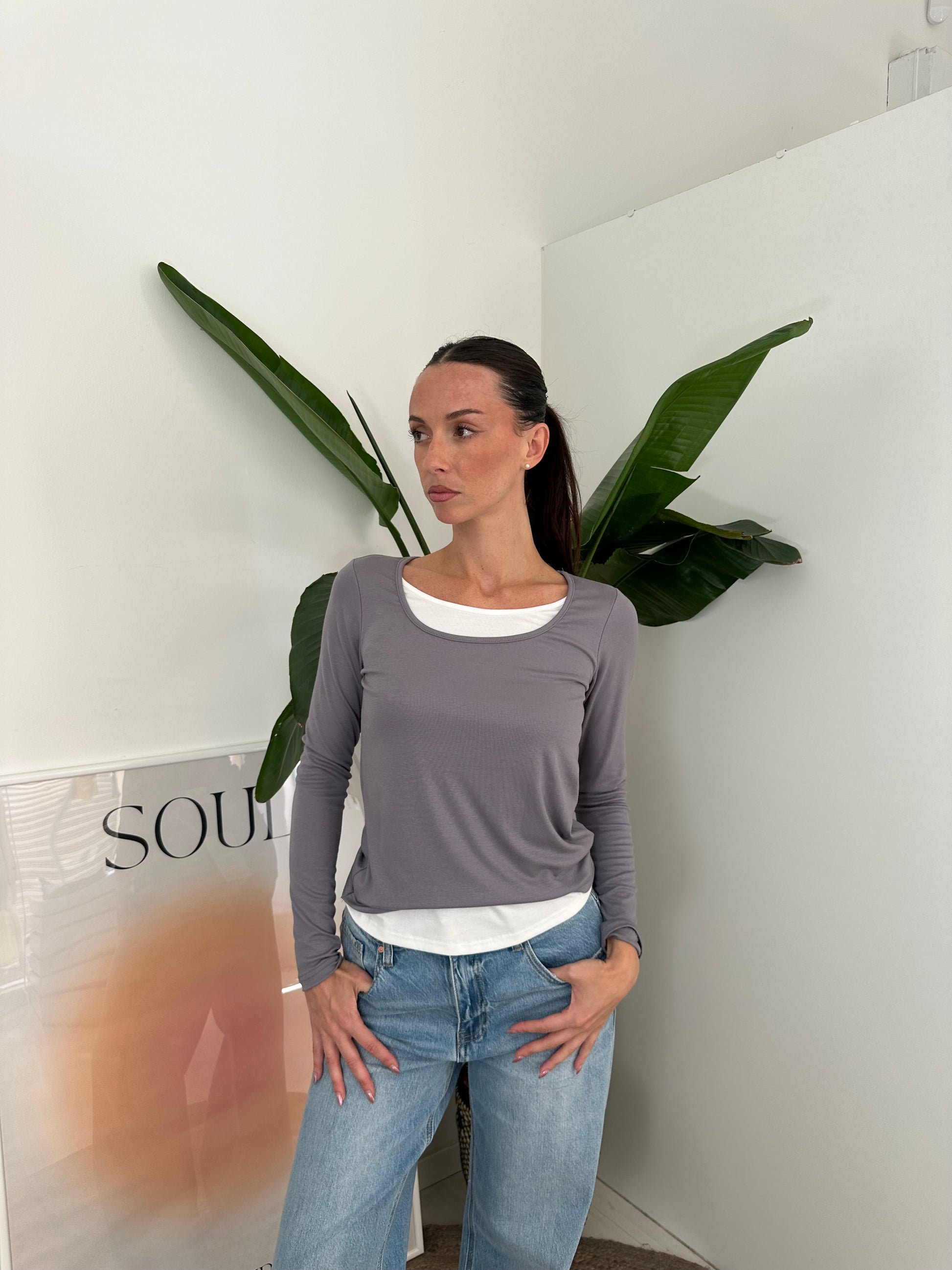 Maglia manica lunga con scollo rotondo e doppio strato di tessuto cucito frontalmente a simulare una sovrapposizione di più strati in un solo capo.