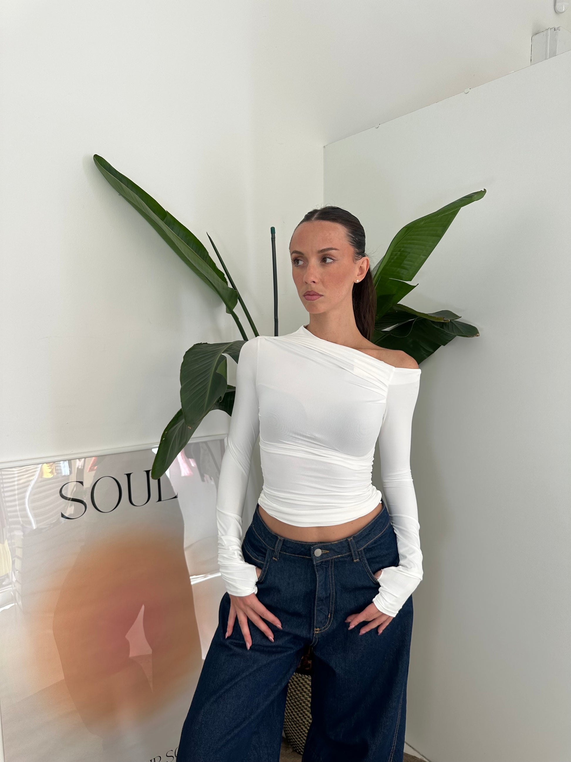 Maglia manica lunga con scollo asimmetrico e manica a guanto. Super elasticizzata e modellante.