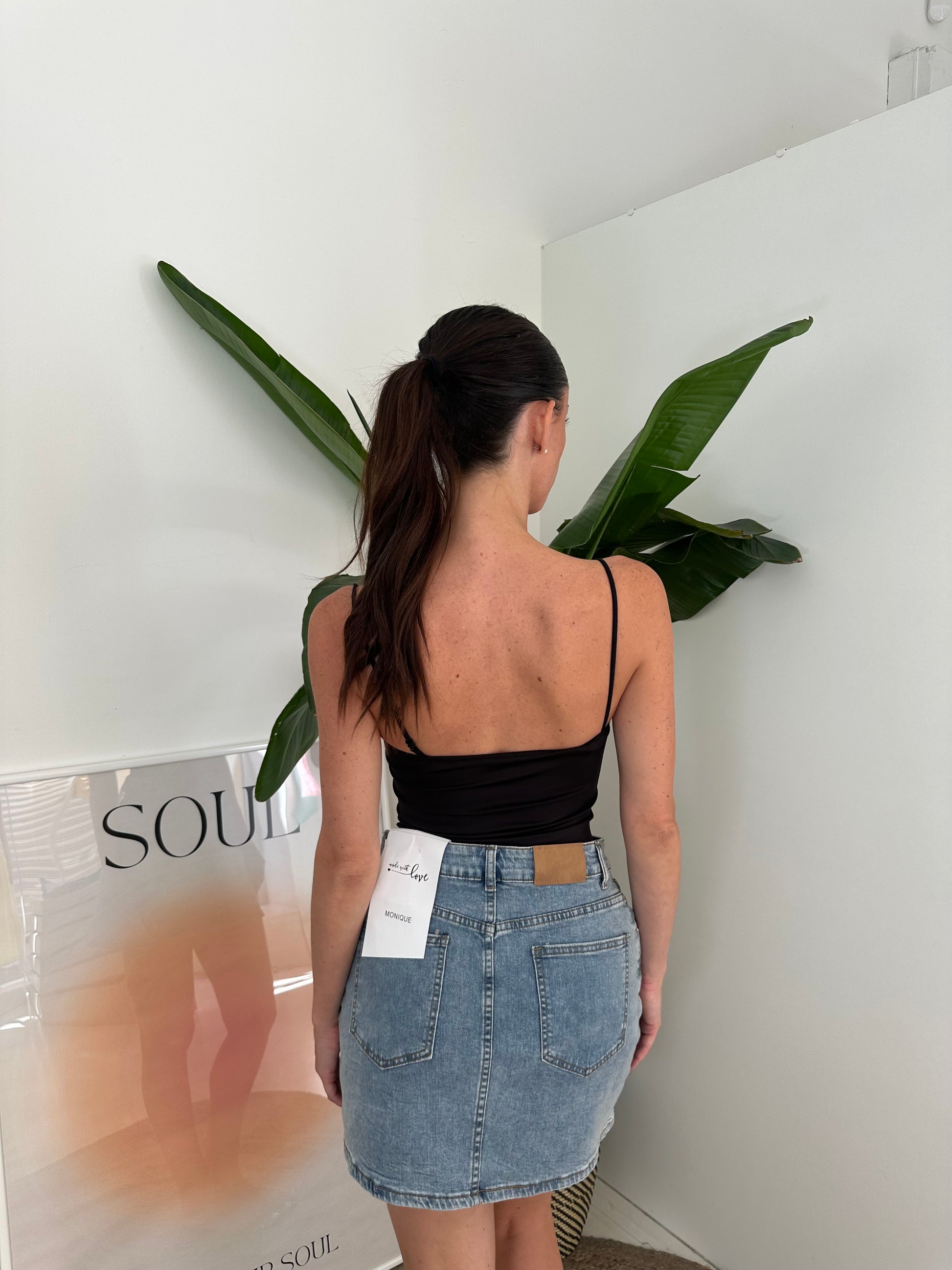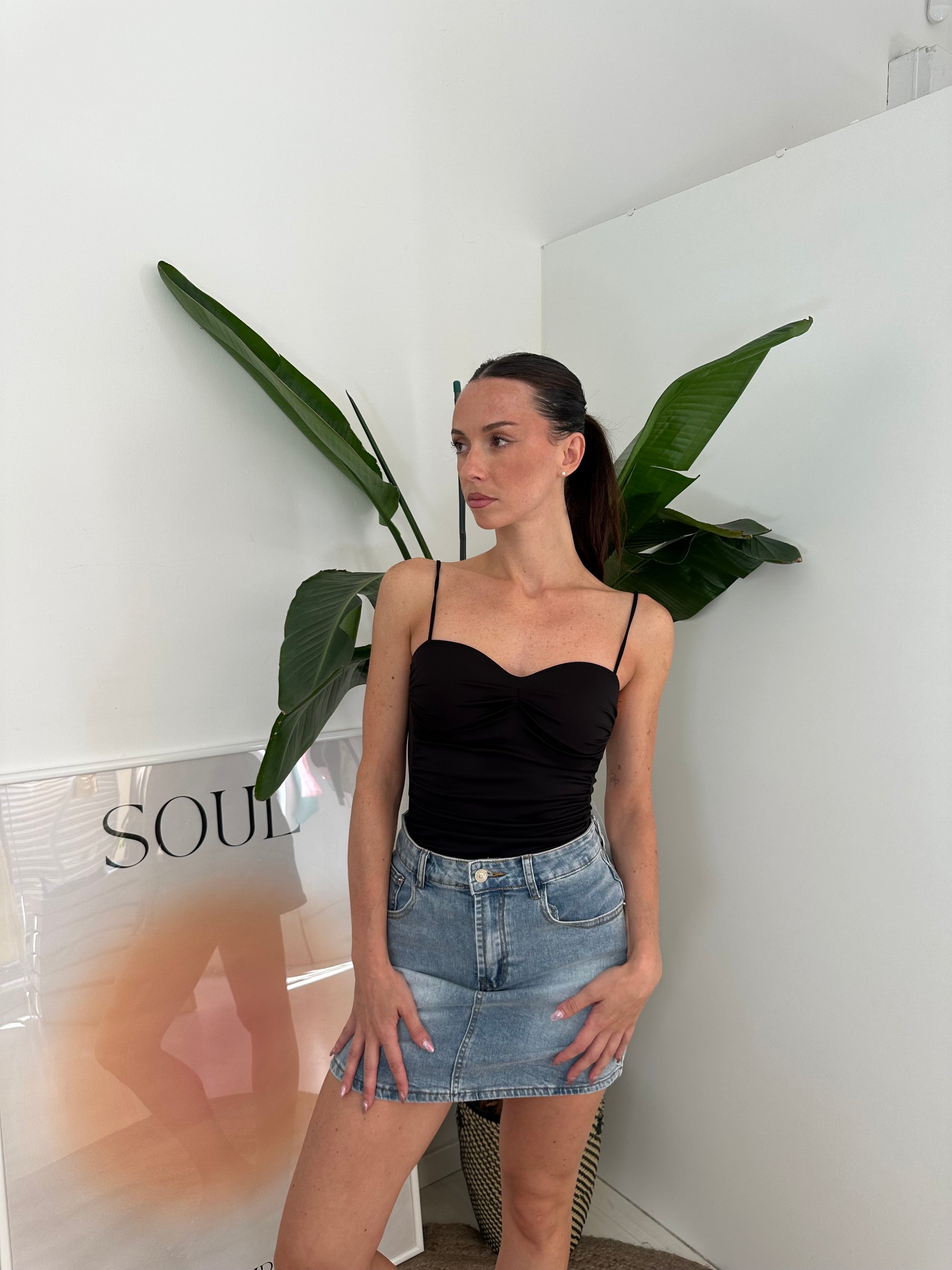 Body elasticizzato con coppe integrate e spalline sottili regolabili.