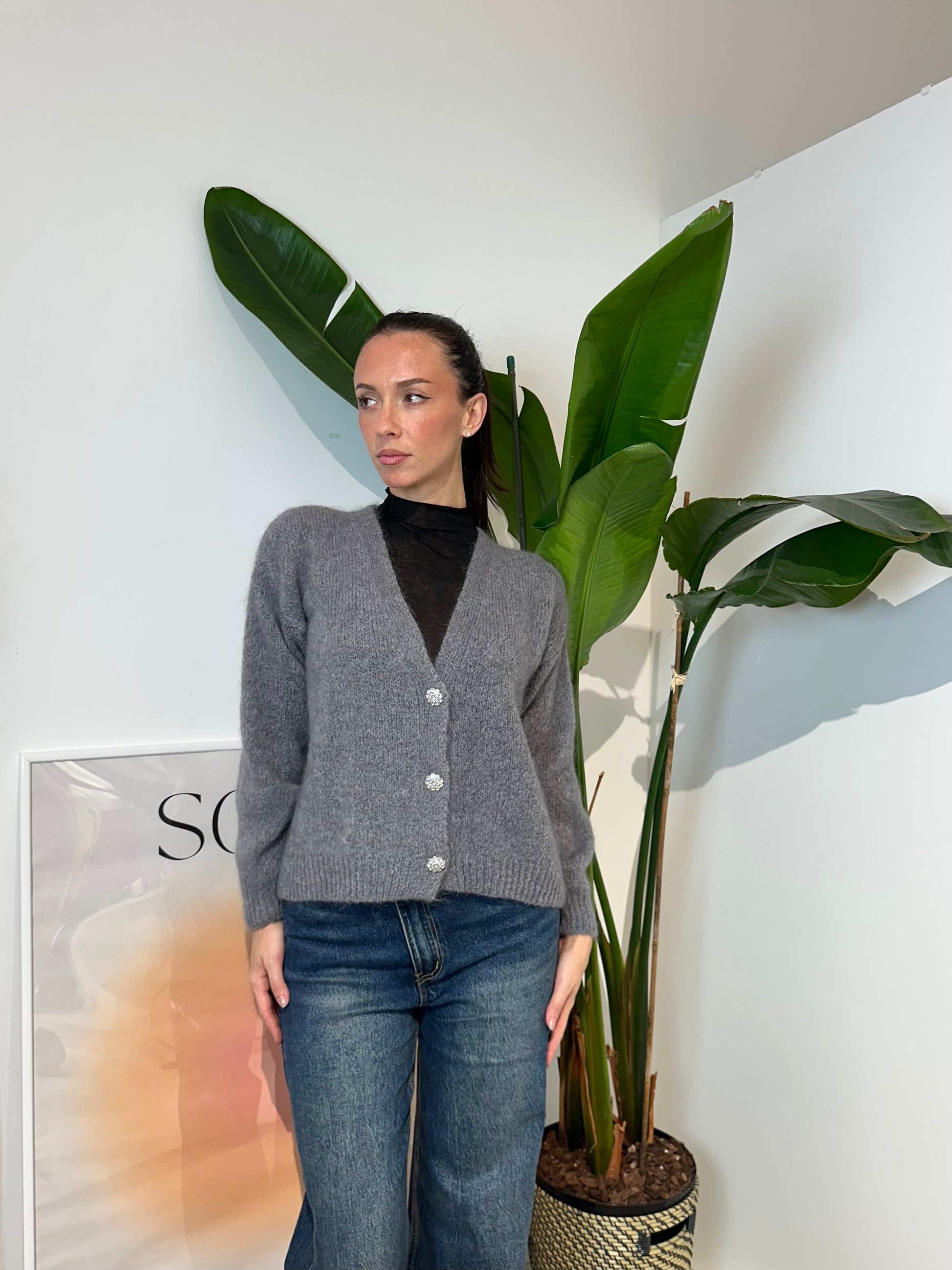 Cardigan misto mohair. Vestibilità morbida e chiusura tramite bottoni gioiello.