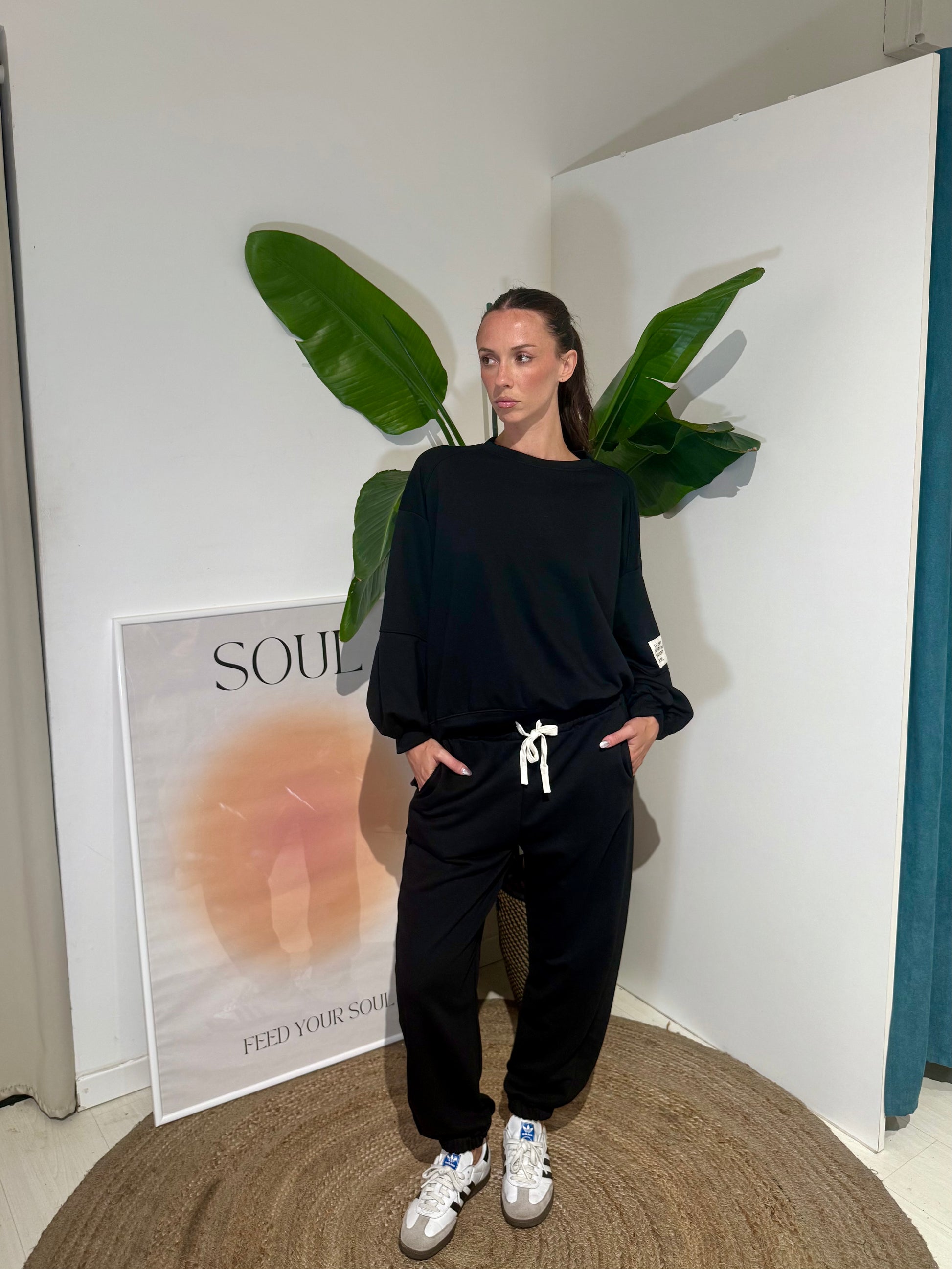 Pantalone sportivo di tuta garzata con elastico regolabile in vita.