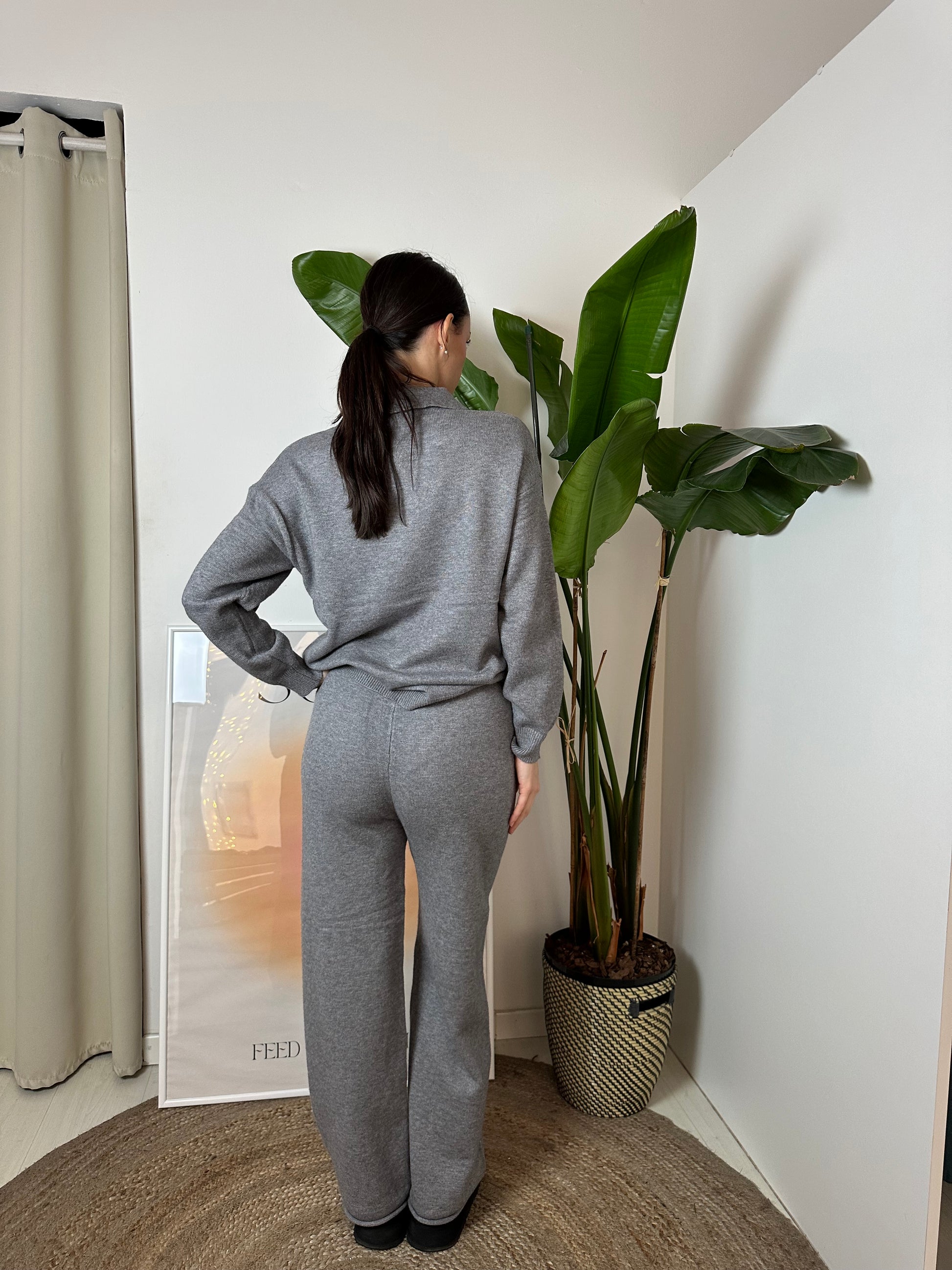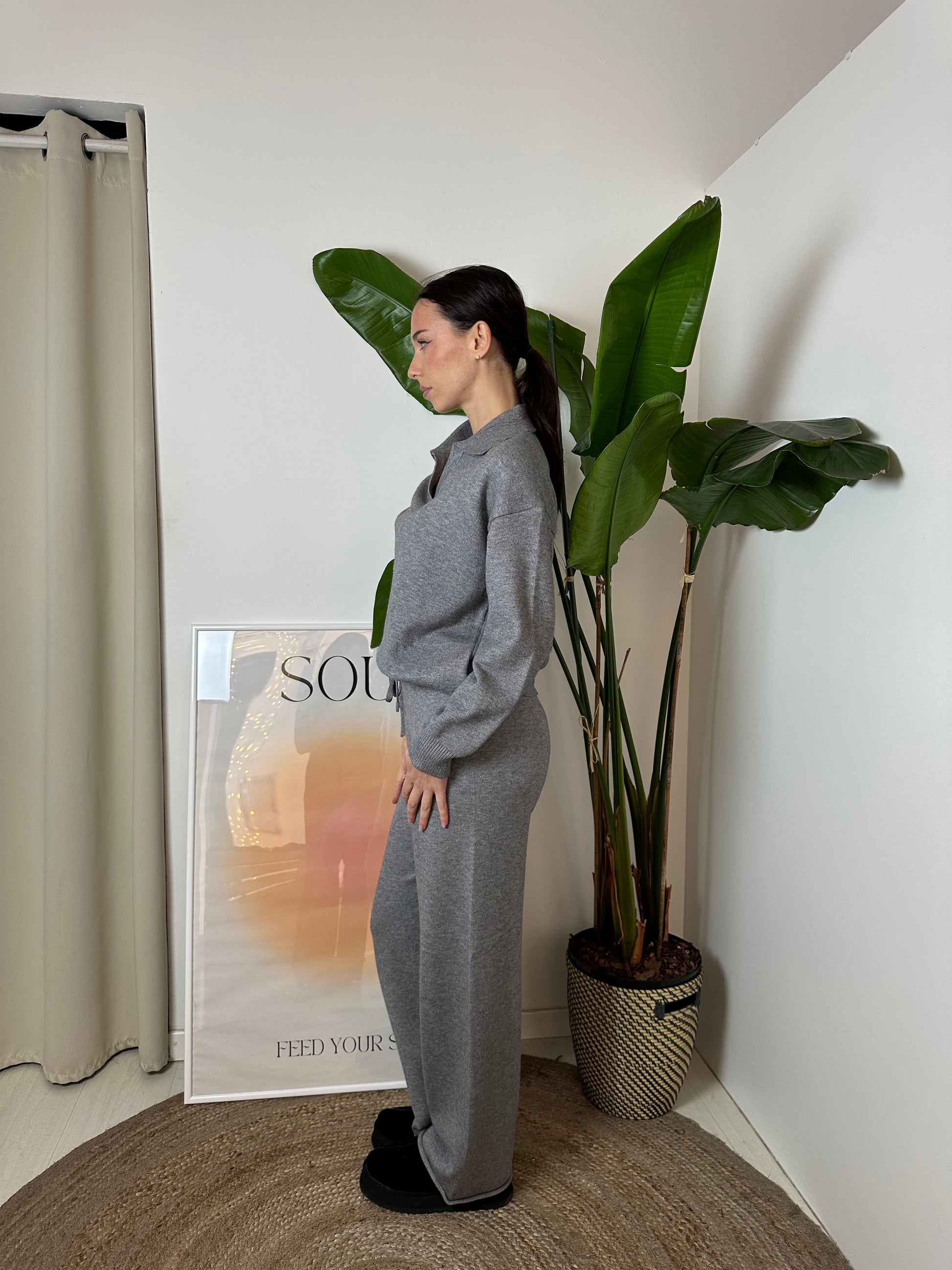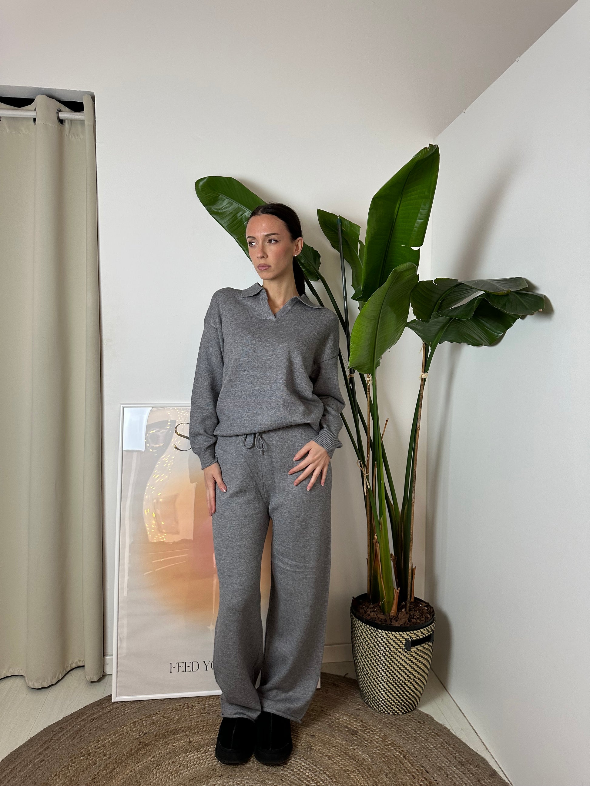 Coordinato composto da morbido maglione con scollo a polo + pantalone con coulisse regolabile in vita.