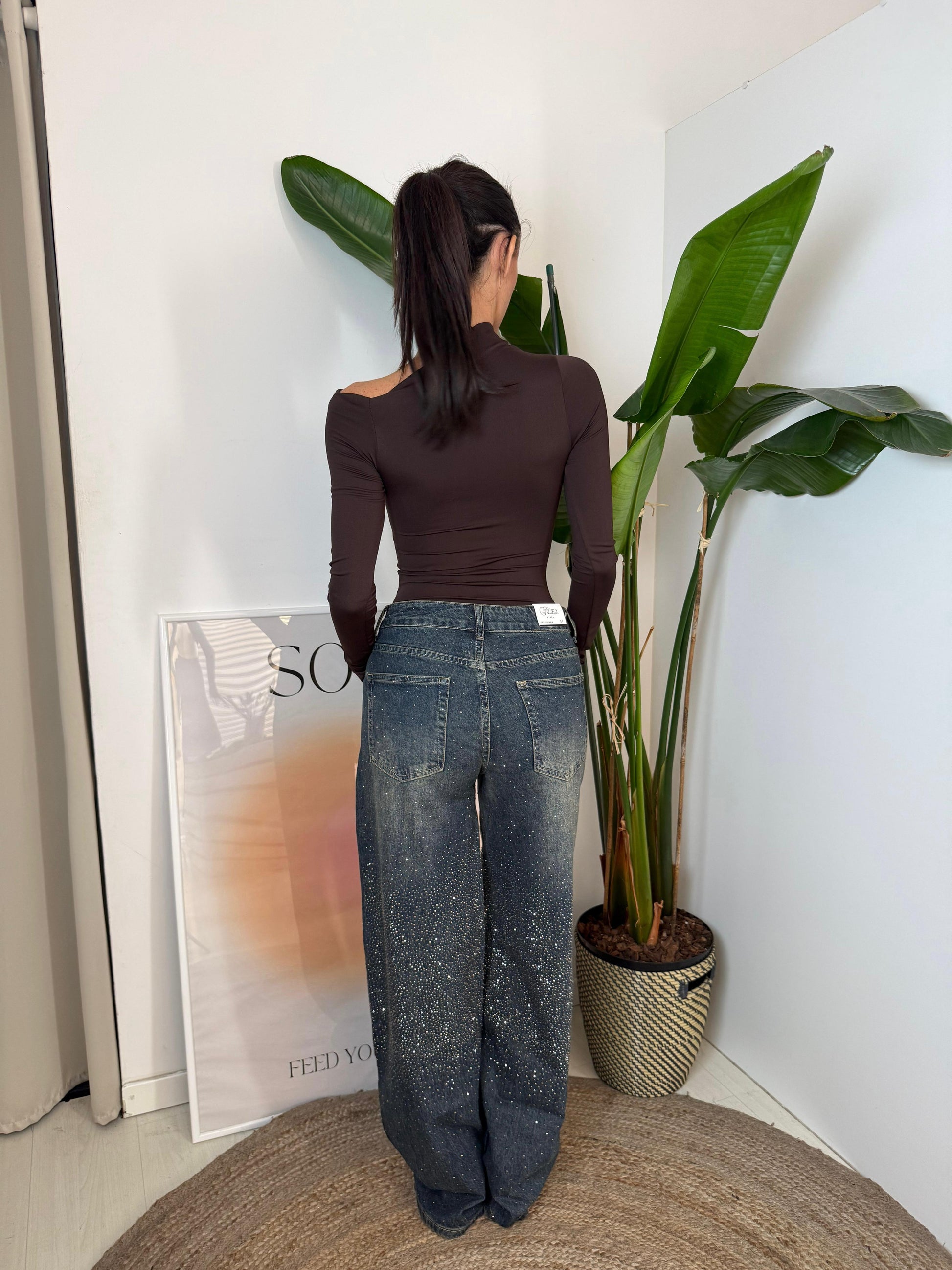 Jeans Palazzo vestibilità baggy con strass applicati su fronte e retro del pantalone.