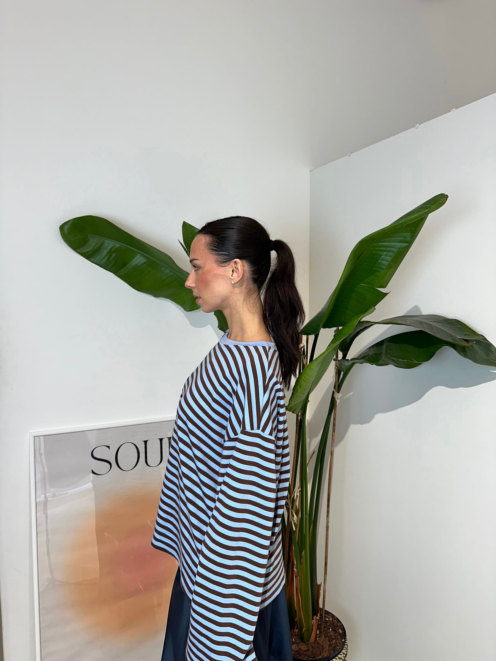 Maglia manica lunga con scollo rotondo. Fantasia a righe. Vestibilità over.