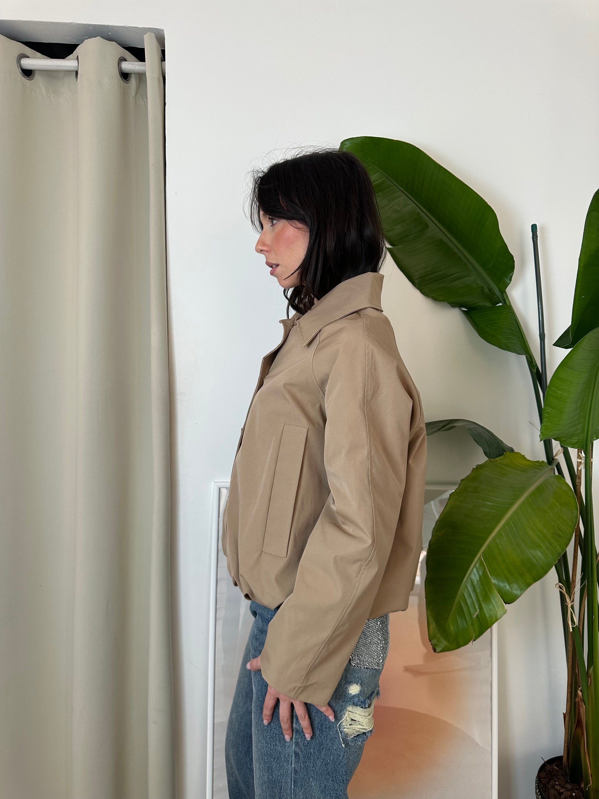 Mini trench bomber trapuntato con chiusura tramite bottoni e doppia tasca frontale.