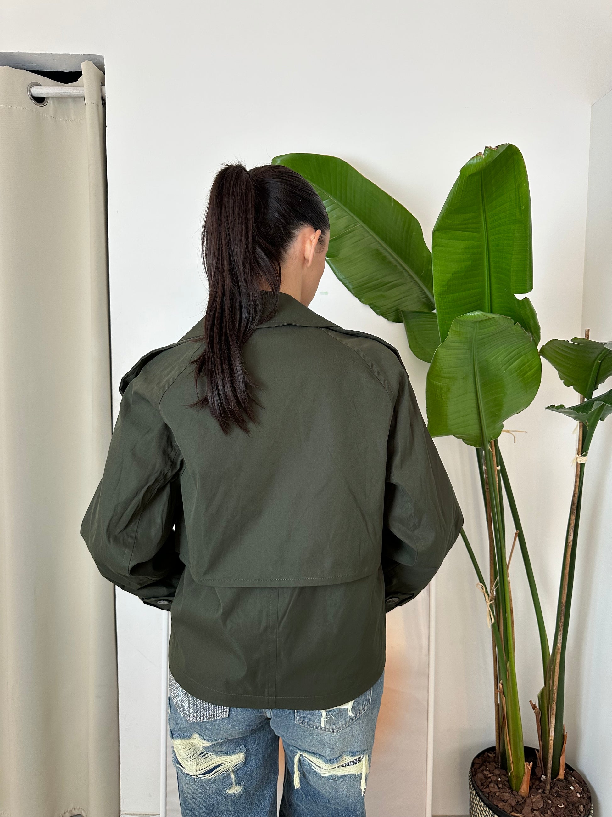 Mini trench con chiusura tramite bottoni e doppia tasca frontale.