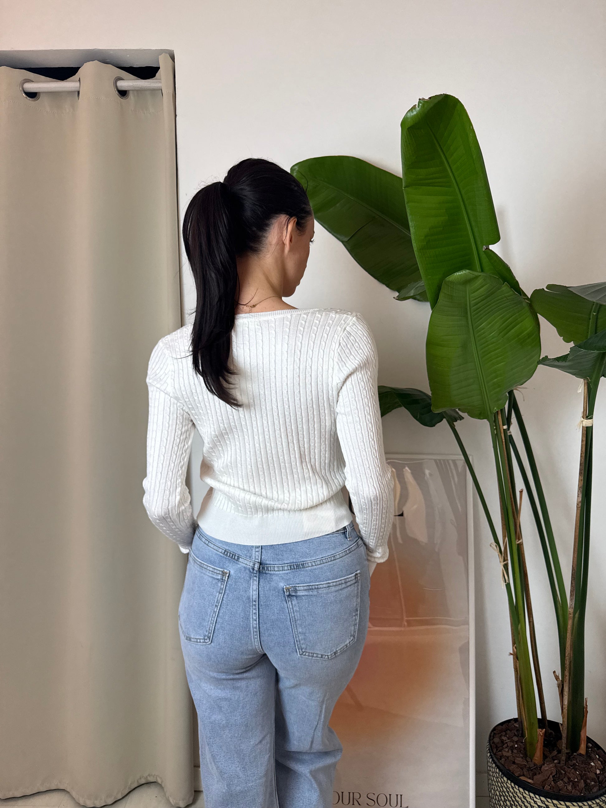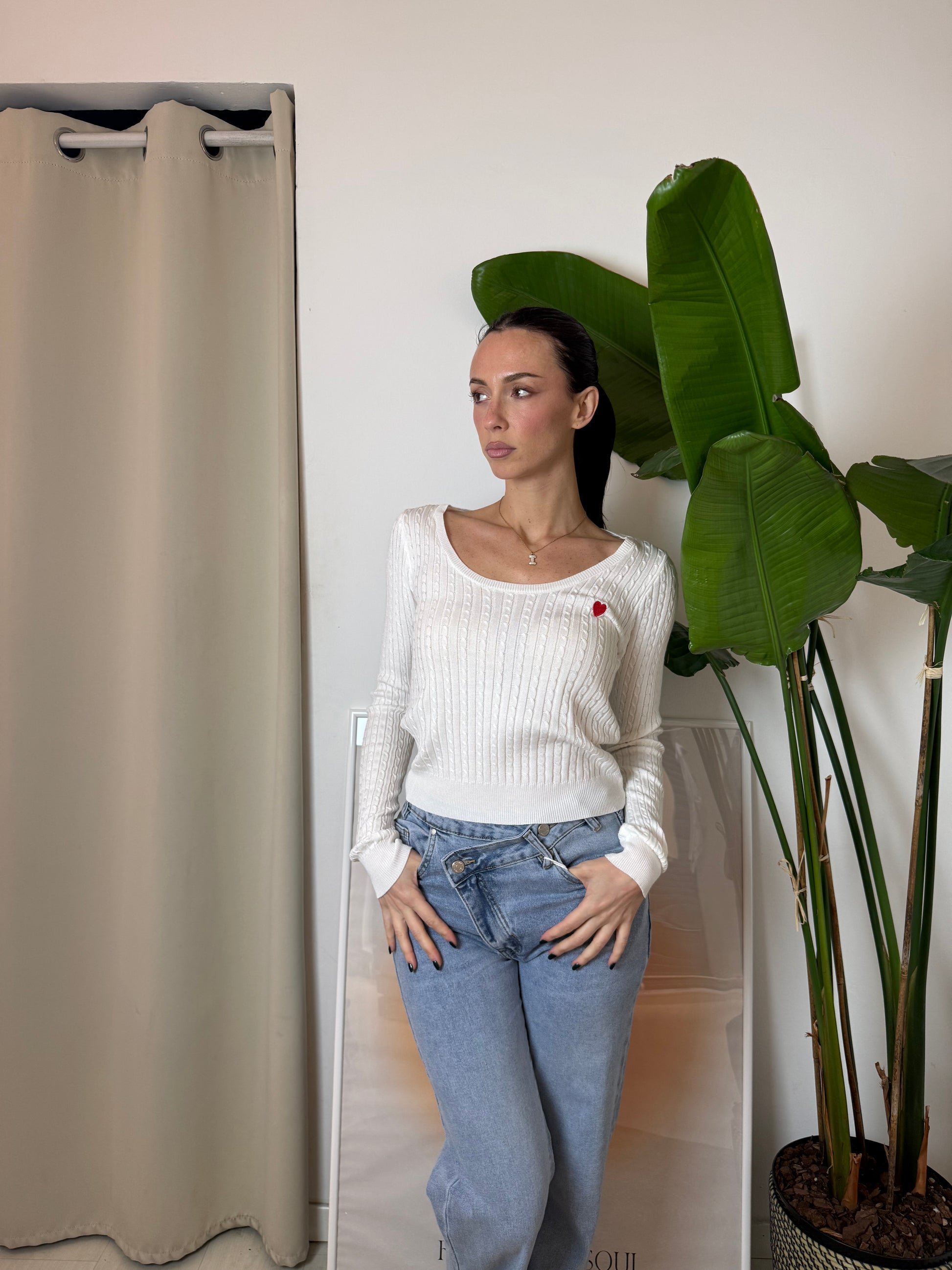 Pullover a trecce croppato con cuoricino ricamato in rosso sul seno sinistro e scollo rotondo. 100% Viscosa